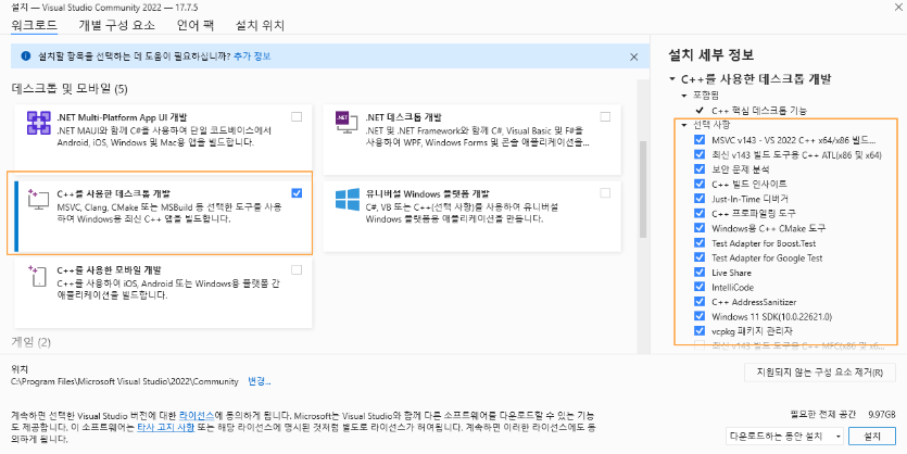 전체설치시 용량이 매우 무겁기 때문에 필요한 옵션만 선별적으로 설치하는 것을 권장 합니다.