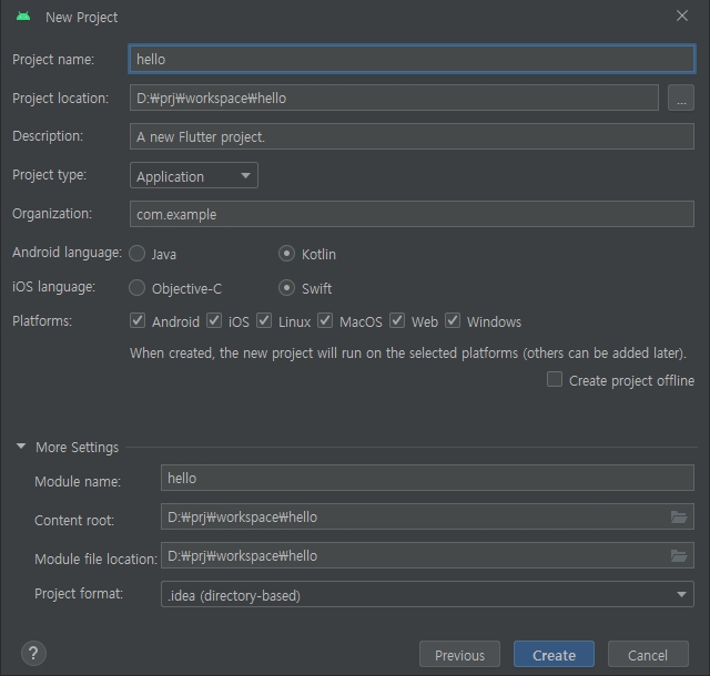 플요한 정보들을 입력합니다.프로젝트명만 입력해주면 나머지 내용들은 기본으로 채워집니다.Platforms 부분은 자신이 개발할 항목만 체크해주면 됩니다.