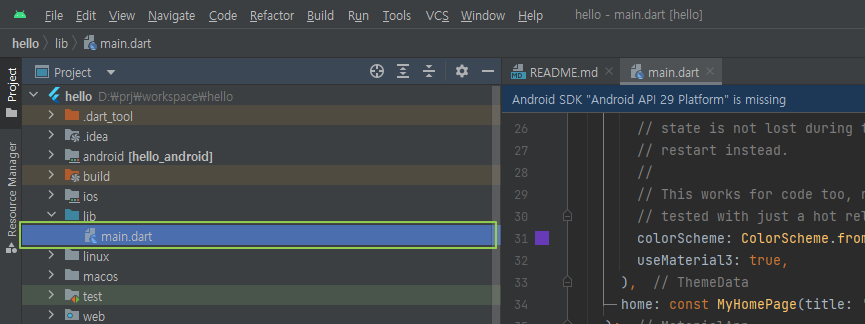 4. 좌측 탐색기를 열어서 lib/main.dart파일 오픈