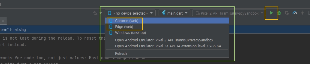 {디바이스가 선택} > {실행해야 할 main.dart파일이 선택} > {삼각형 실행 아이콘 클릭}