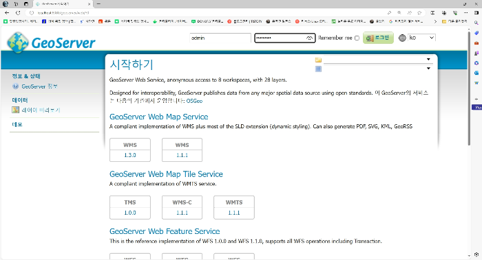 로그인이 정상적으로 완료된 모습이 보인다면 Geo서버가 정상적으로 실행되어 구동되고 있는 것입니다.