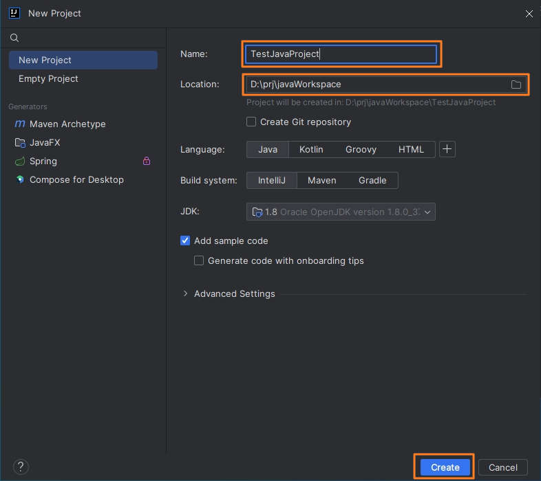 프로젝트명과 프로젝트가 저장될 위치를 설정합니다.