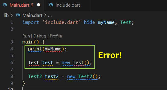 Main.dart의 import 부분을 아래와 같이 변경하면 include.dart 파일에 포함된 myName, Test 요소는