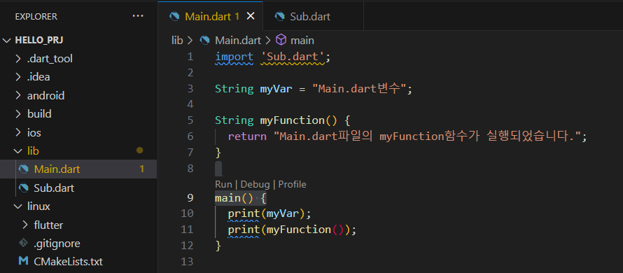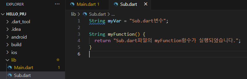 as 별칭을 사용해서 Sub.dart을 import 하고 Sub.dart 파일의 myVar 변수와 myFunction() 함수도