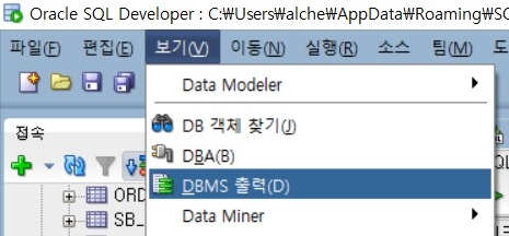 그리고 해당출력창은 상단 메뉴에서 DBMS 출력(D)을 선택해서 오픈하실 수 있습니다.