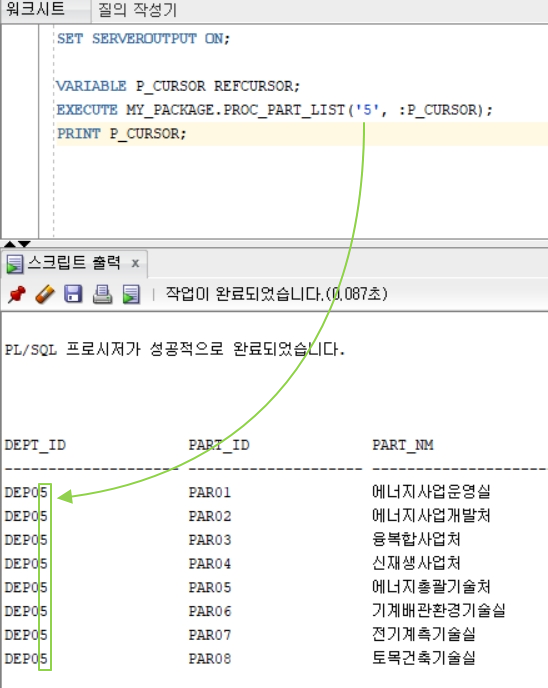 EXECUTE MY_PACKAGE.PROC_PART_LIST('5', :P_CURSOR);