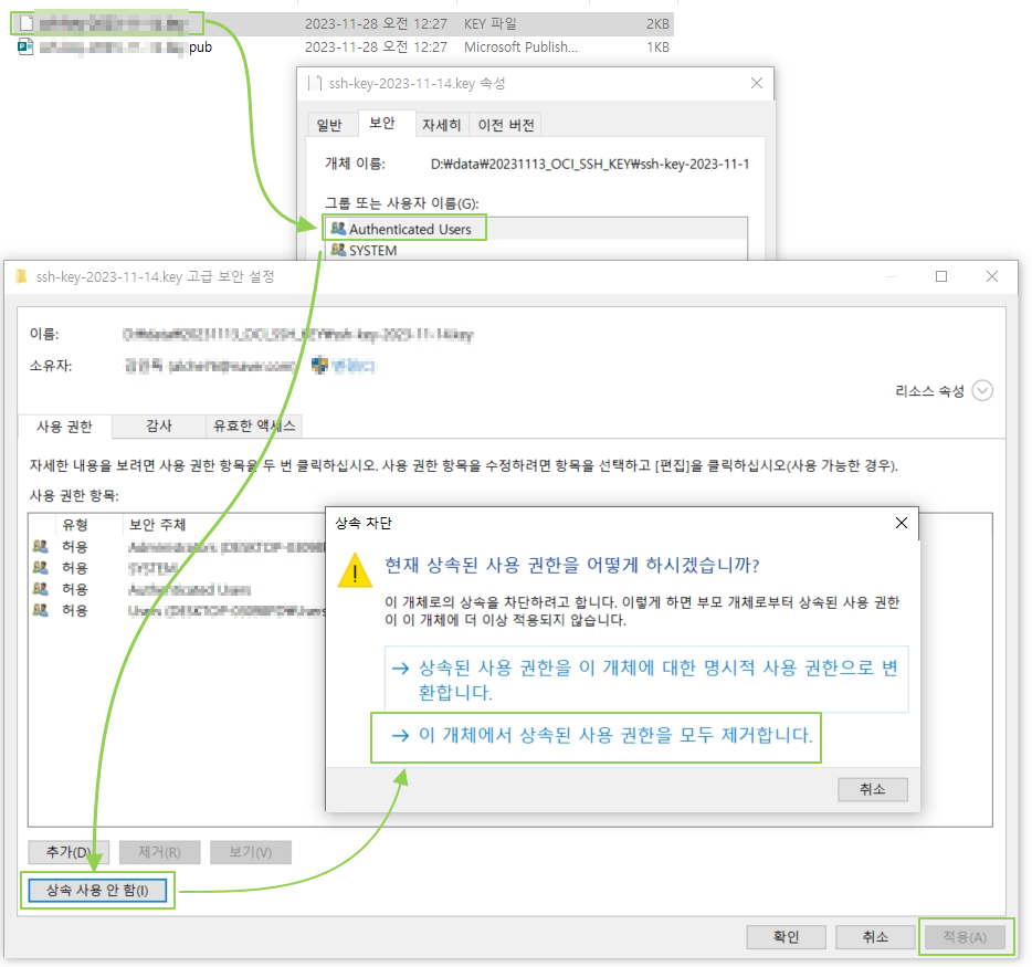 6 - 1. 자신의 private키에서 마우스 우클릭 상속된권한을 모두 제거합니다.