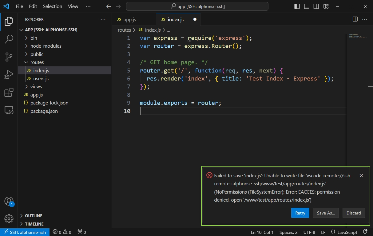 웹사이트가 있는 디렉터리의 권한이 부여되지 않아서 저장시 에러가 발생했습니다.