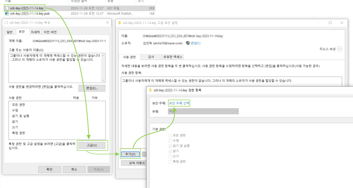 6 - 2. 자신의 private키에서 마우스 우클릭 상속된권한을 모두 제거합니다. 모두 제거하고 나면 사용자 목록에 아무사용자도 존재하지 않습니다. 여기서 다시 키파일에서 우클릭후 보안 주체 선택을 클릭합니다.